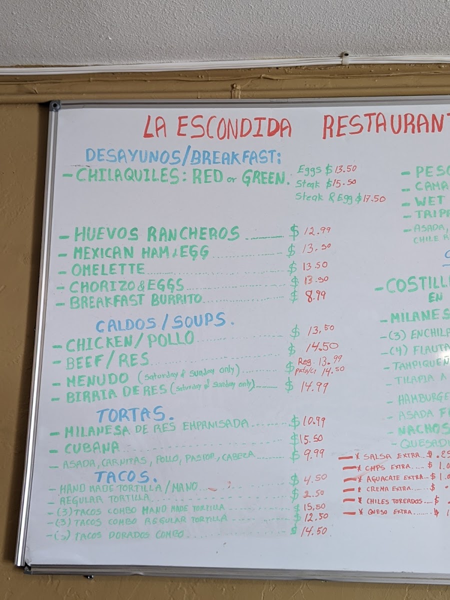 Welcome to La Escondida Restaurant, a hidden gem located at 11181 Azahar St, Ventura, CA. This delightful establishment specializes in authentic Mexican cuisine, drawing rave reviews for its fresh and flavorful offerings. The menu features mouthwatering burritos like the Burrito De Chile Verde and the Chile Relleno Burrito, each crafted with care and served at an unbeatable price of $12.99. For taco lovers, the options range from Seafood Tacos to crispy handmade creations that showcase incredibly tender meats and fresh ingredients.